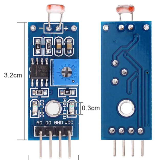 Vous trouverez ce module sous cette forme ou sous forme de copie sur de nombreux sites de vente en ligne. La vue de dessus permet de repérer les composants principaux. A gauche la résistance LDR (de type GL5516) sensible à la lumière (décrite ci-dessous), le comparateur LM393 chargé de comparer la tension aux bornes de la LDR avec une tension de référence réglable. Le potentiomètre permet d’ajuster le seuil de déclenchement en fonction du niveau de lumière. Tourné dans le sens horaire, il augmente la sensibilité. Dans le sens anti-horaire la sensibilité diminue. Les flèches indiquent le sens de réglage.